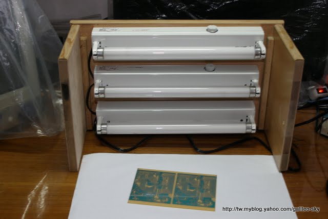 PCB 和 透明稿就三明治 (sandwitched) 在兩片坡片間,